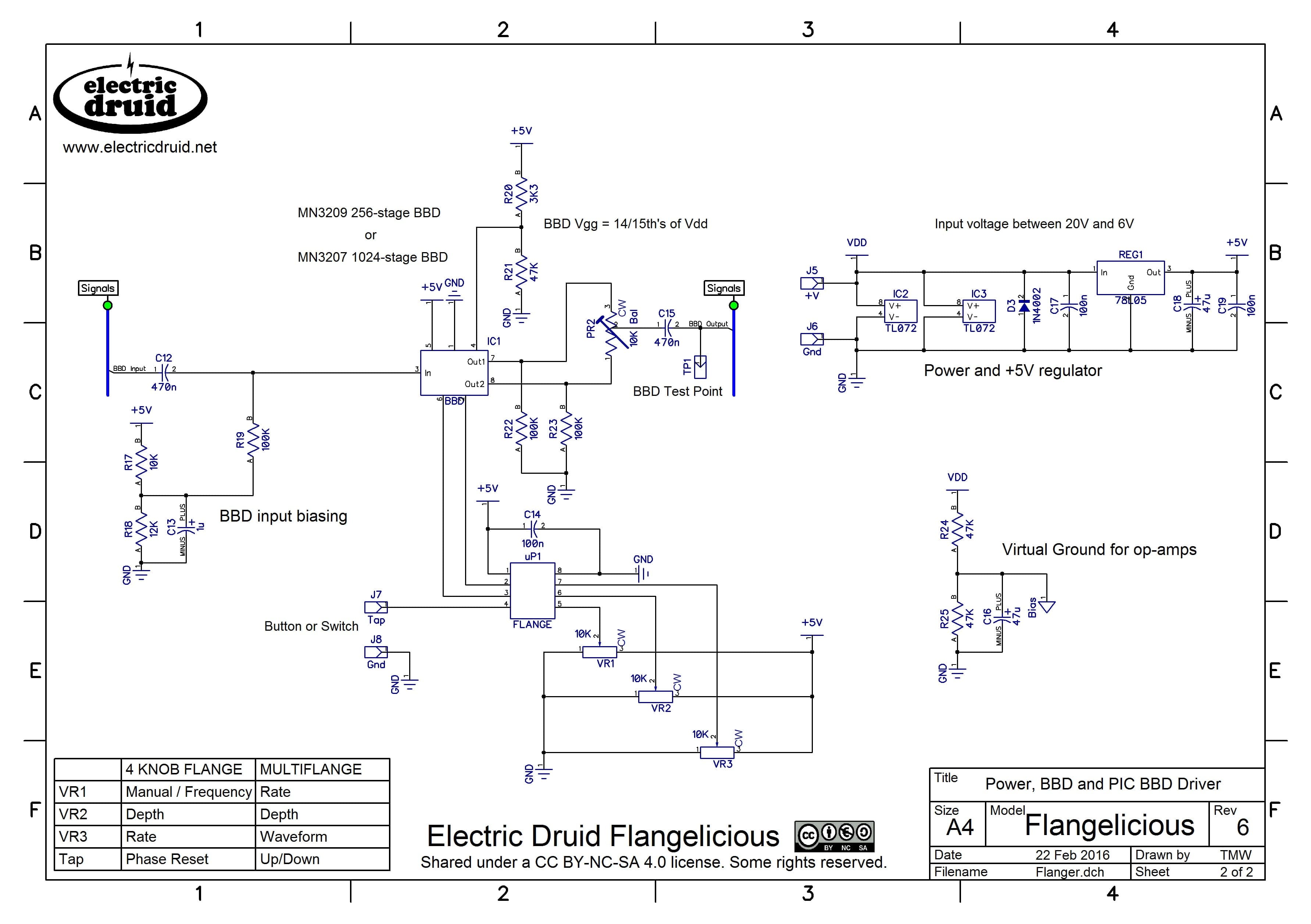 The Flangelicious comes in two versions: a classic four-knob flanger, and a more experimental multi-waveform flanger. They’re identical apart from the FLANGE chip you use, and both versions can be built with the same PCB with no component changes, and both versions can use either vintage MN3207s or modern V3207s or other clones. You can even build one PCB, and swap FLANGE chips and BBDs back and forth.