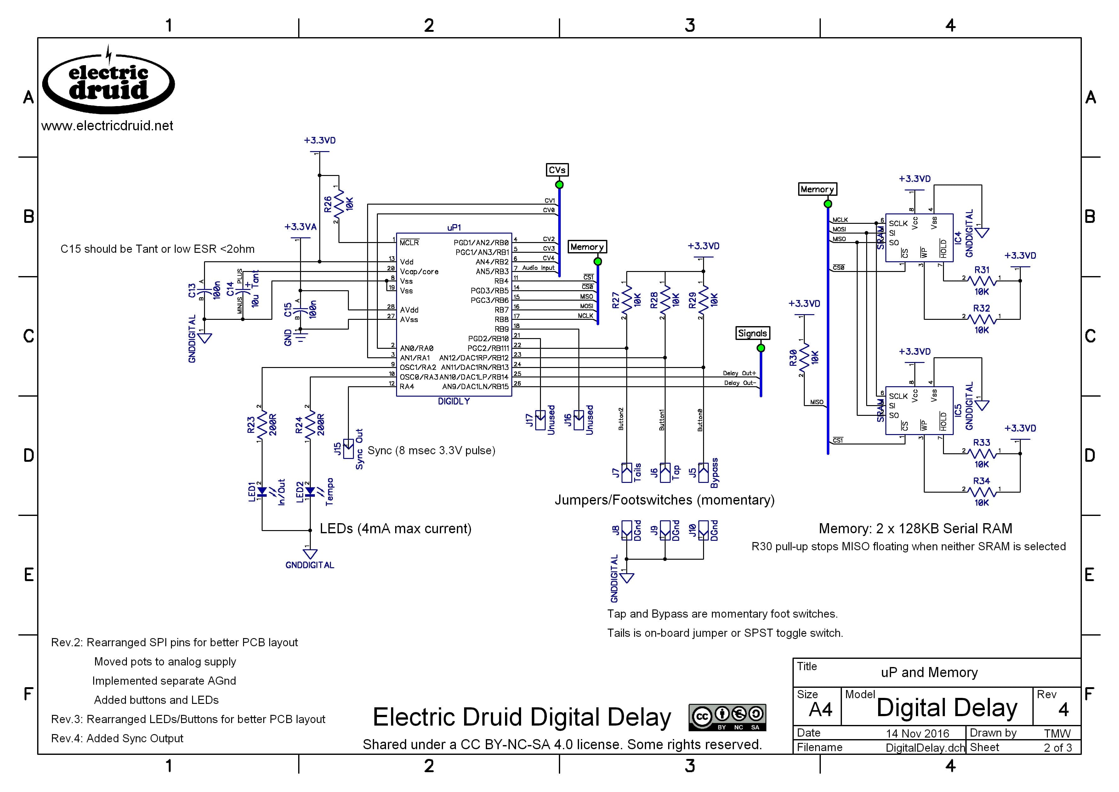 The DigiDelay is a DIY delay project that offers features well beyond what you’ll see from a PT2399! It has 4 seconds of delay, provides delay trails, has tap tempo, keeps the dry path entirely analog, has high and low tone filter controls, uses a momentary/latching feature on the bypass switch for “echo splashes”, etc etc – it’s got the lot!