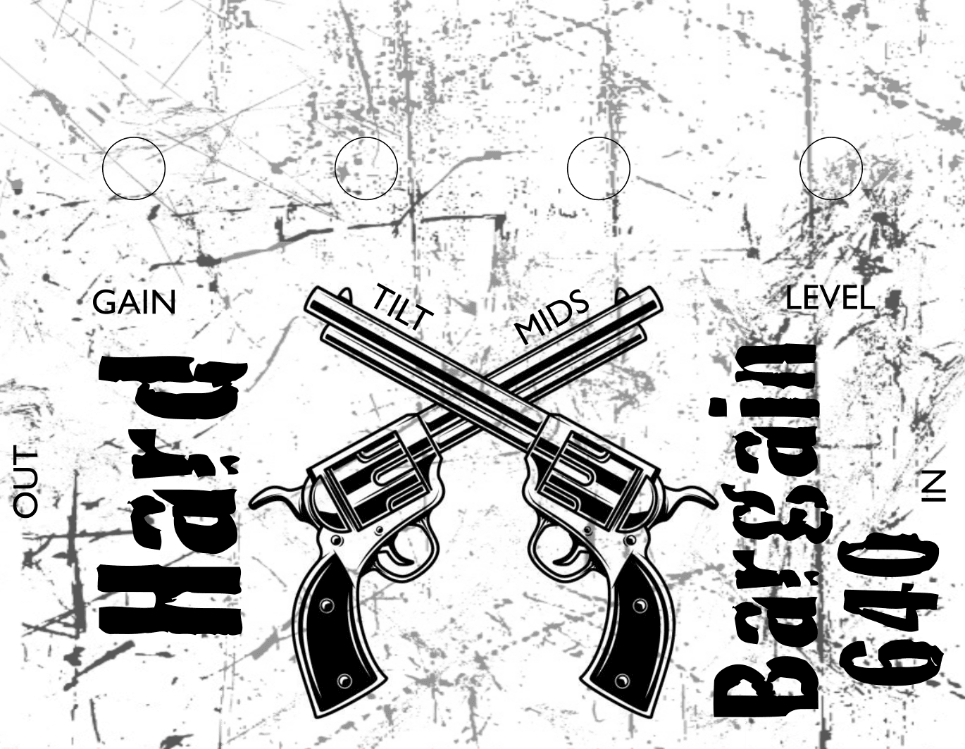 The Hard Bargain is a high gain distortion with an unusual two knob tone control, offering a “Tilt” knob that changes the balance from Bass-heavy to Trebley-bright, and a Mid cut/boost control that can provide a peaky midrange sound or a classic scooped drive sound.