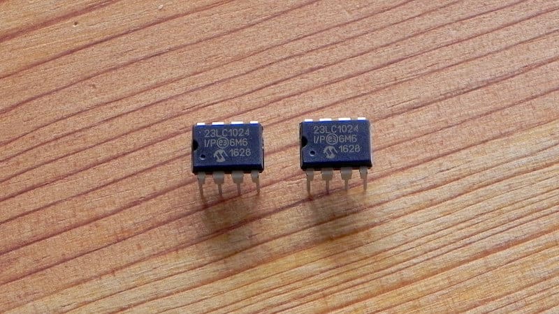 The 23LC1024-I/P is a 128KByte RAM chip with an SPI serial interface. Two of these chips are used in the DigiDelay project to produce up to 4 seconds of delay with 16-bit data and a 32KHz sample rate.