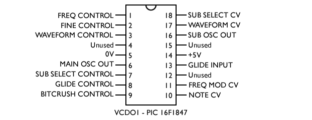 The VCDO chip is a powerful voltage-controlled 8-bit wavetable oscillator. It includes a sub-oscillator, a glide feature, and separate modulation inputs for frequency and waveform modulation.