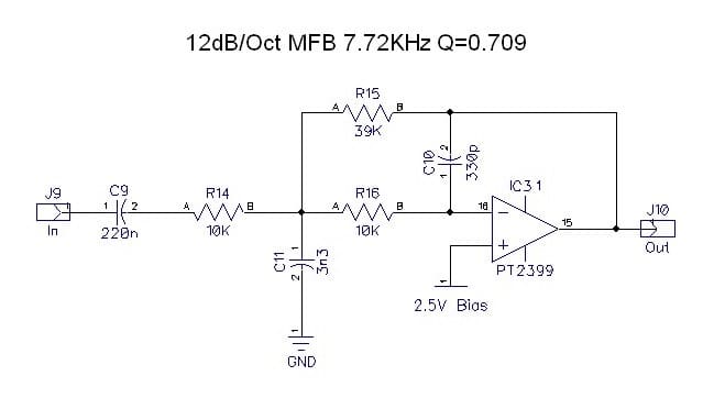 I use the Okawa Filter Design Tools for jobs like this. The PT2399 is set up for multiple-feedback filters, and the tools allow you to design those by entering a required cutoff and resonance (the Butterworth resonance of 0.707 is typical), or by entering values to see what you get. I usually start off with the cutoff and resonance, and once I’ve got a first draft, I usually go back and forth a few times tweaking values to get something that doesn’t use any hopelessly unlikely part values and still gives decent performance.