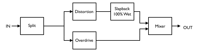 While the obvious applications of this pedal are to get that 50’s Rock’n’roll or Rockabilly sound, there’s other things you can do with it too. It’s providing a single delayed copy of your signal, so it’s good for “double tracking” type sounds as well. You can increase the effectiveness of double tracking by making sure the two sounds are not identical. Rather than just adding the slapback last in the chain, use a splitter to create two paths and delay one of them using the Slapback set to 100% wet. Use different effects on the two paths. This gives you the sound of two guitarists playing together much more convincingly than simply adding a single repeat to one sound.![]()