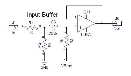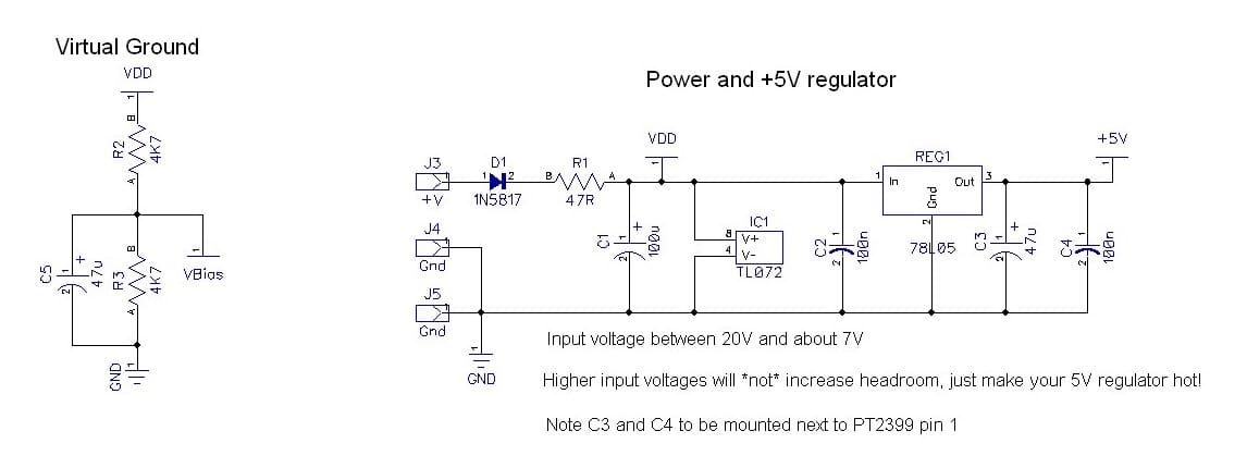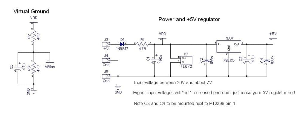 We also need a “virtual ground” 4.5V bias supply for our op-amps, so R2/R3/C5 create that.