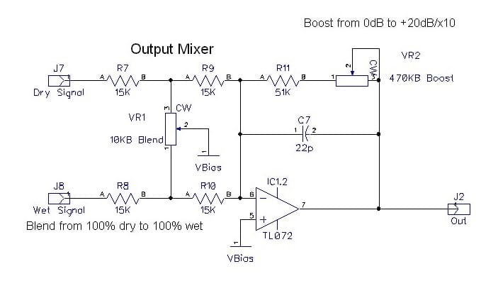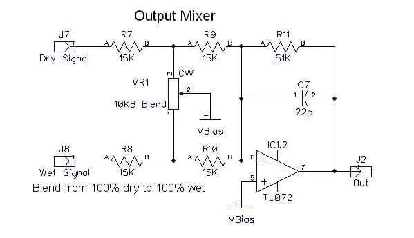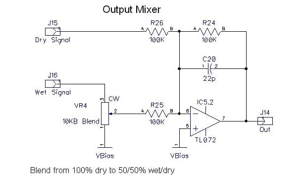 The Blend knob offers a full blend from 100% dry to 100% wet. There are basically two types of Blend knob you see on delay-based pedals. One type mixes the dry signal in permanently, and then allows you to add wet signal as well, with the maximum amount of wet signal usually being the same as the dry level, so a 50/50% mix of wet and dry. This is easily done with an op-amp mixer circuit, as shown below.This type of control shows up on old Boss stuff a lot, where they use a FET switch to disable the Wet path to switch the effect on and off.