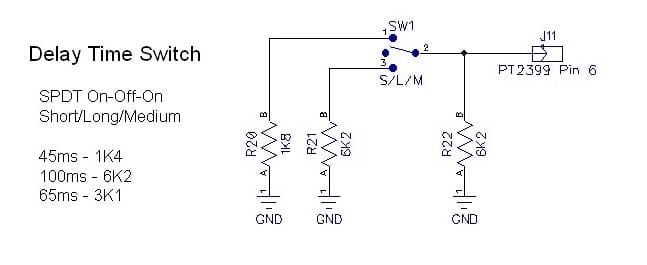 The PT2399 uses a resistor from pin 6 to ground to set the delay time. But what resistor value gives the time we want? The information we need is over on my page “Useful design equations for the PT2399“:
