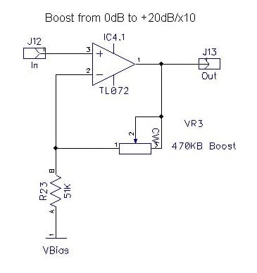 The final part of the circuit is a simple boost. Again, there are various ways we could do this. One obvious way would be to stick a non-inverting op-amp gain stage on the end, with the gain wired up to go from unity (0dB) to x10 (+20dB).