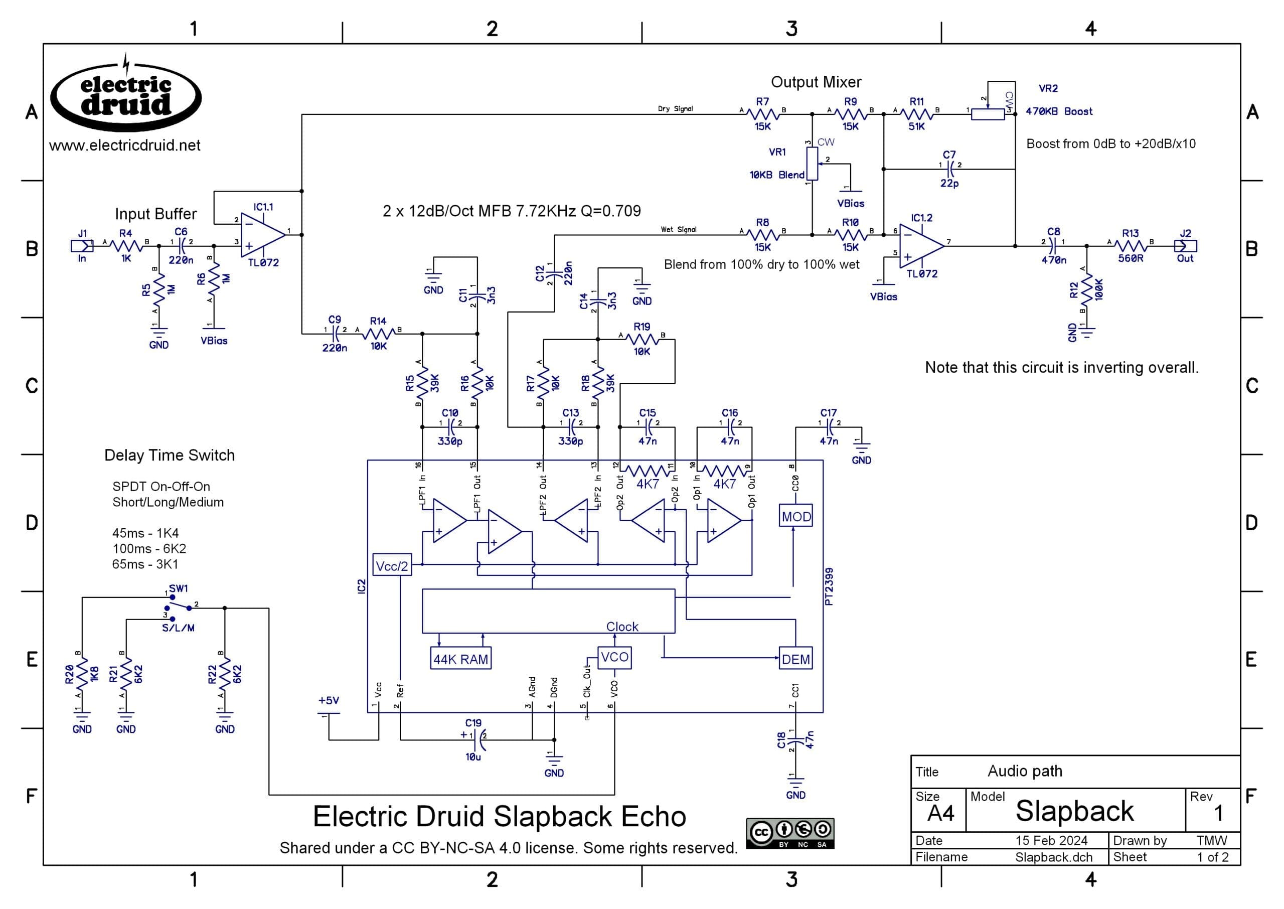 I recently saw an advert for the new EHX Slapback Echo reissue pedal and thought it was a cool little thing and would make a nice project. The original pedal came out in 1978 and was about as simple as it could get. There was one “Blend” knob to mix the straight and delayed signal, and a “Filter” switch for a bit of tone control. It wasn’t a great success. Everyone says the sound is too dark. The new one makes several improvements. As well as the “Blend” knob, it also has a “Boost” knob, and instead of the Filter switch, it has a three-way selector for delay time (the original was fixed at 100msec, I think). It’s also in what EHX call a “Pico” enclosure, which is basically a Hammond 1590A, so it’s a tiny little thing compared to its hulking ancestor.