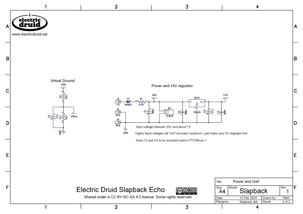 The only other part we need is the power supply. Like the buffer, this is standard stuff. We have a 9V input, with D1 for polarity protection, and R1/C1 to provide some power supply filtering. C2 bypasses the op-amp supply, and the 78L05 regulator provides a +5V supply for the PT2399. Because of the PT2399 running on a fixed supply, there’s no point trying to run this circuit at a higher voltage to get more headroom. It works for the buffer and the blender, but a higher signal level will just give more clipping in the delay, so there’s no real point. It will also make the 78L05 regulator get hot, since it’ll have to drop a lot of voltage to maintain a 5V output.