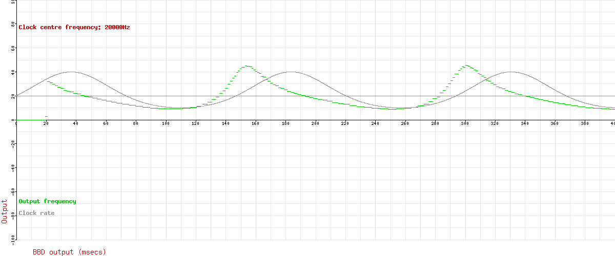 But hang on a minute! Our frequency modulation isn't following cos(x) for our sin(x) LFO! It doesn't look like the cyan line either! Well, no. The problem is that there's also the overall delay. For the lowest output frequency, that's roughly the delay at the lowest clock frequency, so you'll see that the lowest point on the green line is quite a long way after the lowest point on the cyan line (to the tune of about 3 squares – 30msecs). For the highest output frequency, the delay is much shorter, since it is almost the delay at the maximum clock rate. Thus the highest point on the green line is also after where the highest point on the cyan line, but by much less (probably only one square – 10msecs). This changing delay is what distorts the modulation.