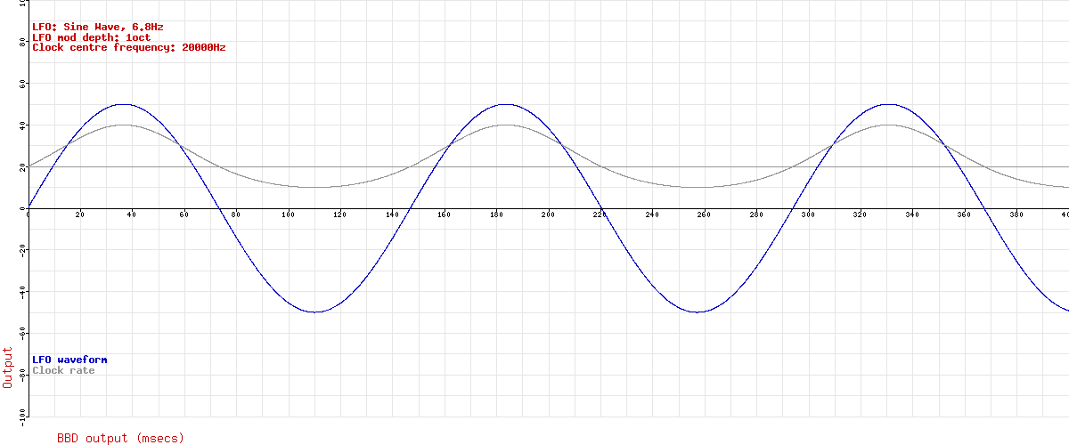 So what's going on here? Think about how the BBD makes a pitch change. When the LFO output is rising, the clock frequency is increasing, and samples are being read out faster than they were read in – their pitch is shifted up. Likewise, when the LFO is falling, the clock frequency is decreasing, and samples are read out more slowly than they were read in – the pitch is decreased. The key here is that the pitch shift is not caused by a high clock frequency or a low clock frequency, but by an increasing or decreasing clock frequency. It's the rate–of–change of clock frequency that's important.