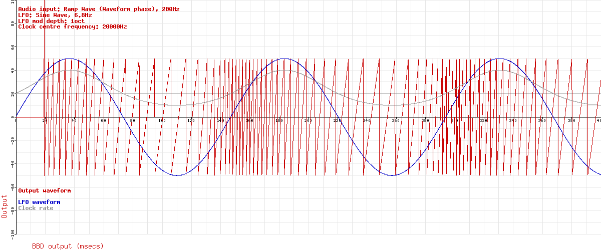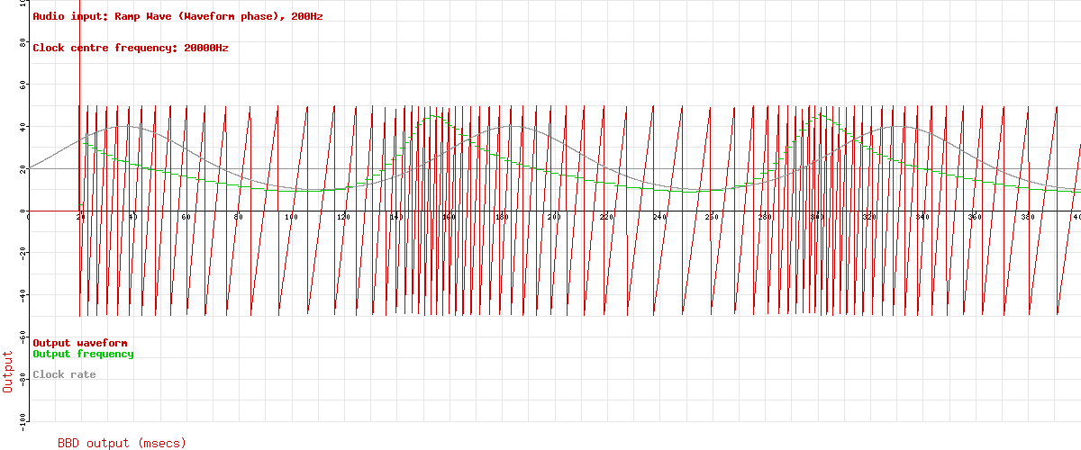 Ok, so far, so good. Let's feed some audio into it and see if we can see anything happening. Remember this is just the signal through the BBD (the “Wet only” signal), so it's not a full chorus. In fact, it's just a vibrato unit. But mixing the dry and wet signals together is easy, and that's not the bit I don't understand, so I'm ignoring the dry signal. This next graph adds a low audio ramp wave (red). You can easily see the pitch change caused by the clock modulation. Notice the initial delay before any signal comes through the delay line is clearly visible on the left hand side of the graph.